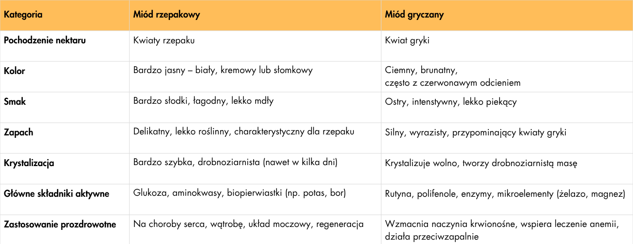 Miód rzepakowy vs Miód gryczany - Tabela porównawcza