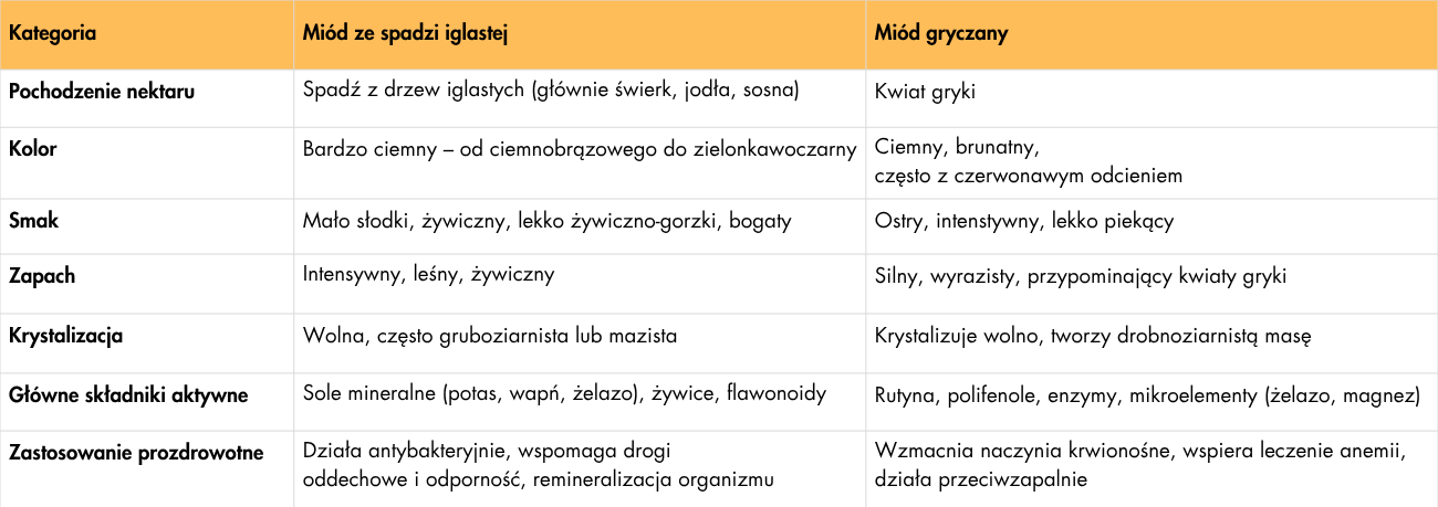 Miód ze spadzi iglastej vs Miód gryczany - Tabela porównawcza